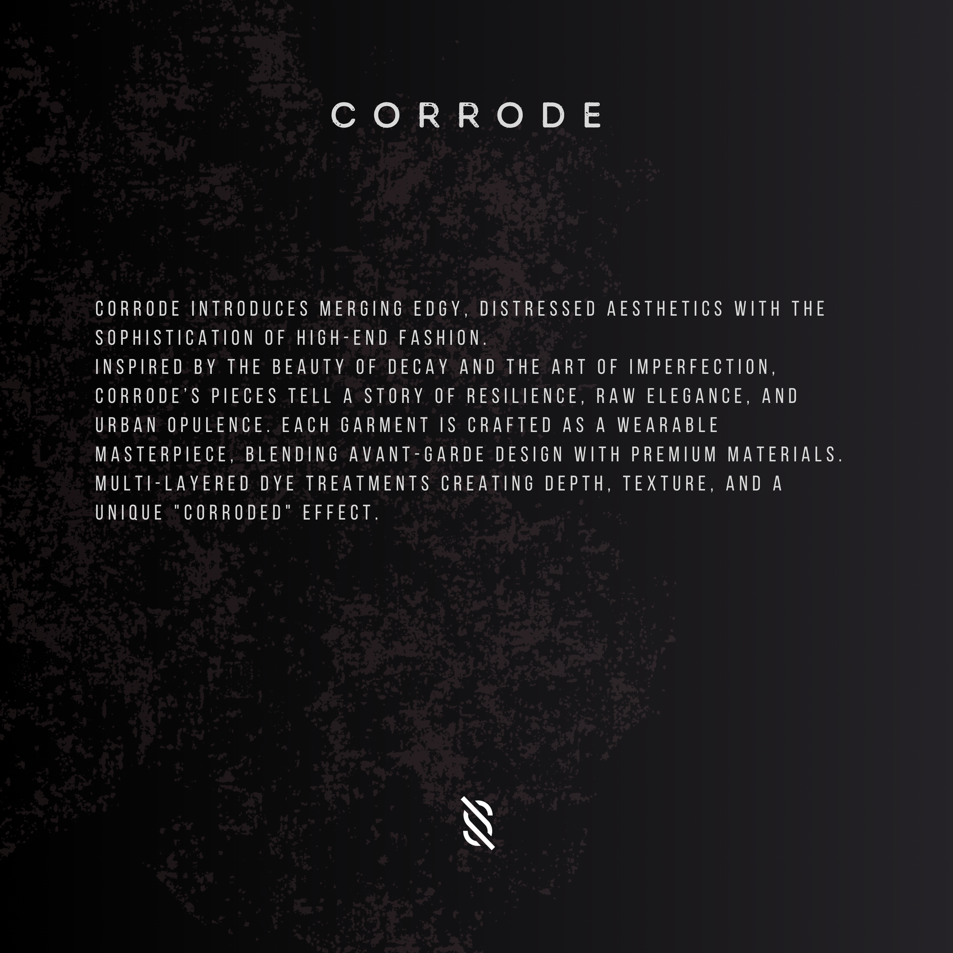 is a study in refined decay. This elevated essential is cut from ultra-soft, heavyweight cotton and finished with Corrode’s signature acid wash, creating a uniquely marbled texture across each piece. Tailored with a structured drape and raw-edge detailing, it’s effortless, intentional, and unapologetically undone.